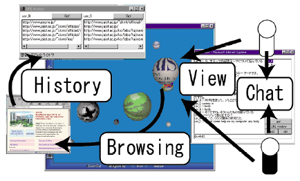 WWW上で複数の人間で協力しあってブラウジングしようとしたとする。その際、報告者らは既存のWWW環境では、複数の人間が探索しているという行動の把握、しかも他者がどの辺りのWWW空間を探索しているかの実態を認識できない。そこで、共同してWWW空間を探索するのに有用なURL表示の可視化とそこでの視点のリアルタイム表示を行い、ブラジングを協調して行う行為をWWW探索アウェアネス(あるいはコラボレーションブラウジング)と呼ぶ。WWW探索アウェアネス情報を提供するシステムを坂本が試作[22][23]した結果、他人の存在、動作をある程度予測でき、他ユーザとの円滑なコミュニケーションを促進し、一人では見つけられないホームページを多数見つけ出せることを実証した。ホームページ間の位置関係の空間配置は、リンクのジャングルを探索する際の手掛かり情報を提供する。納豆ビュー[27]の探索モードでの改良版とも言える。WWW探索アウェアネス環境を図 3.4-1に示す。
