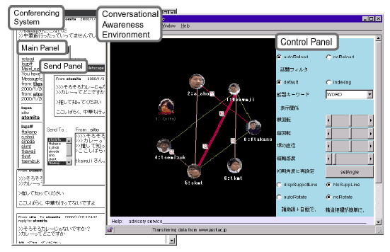 インターネット上でテキストベースコミュニケーションを行う割合は圧倒的に多いが、その際仲間同志のコミュニケーション過程のリアルタイムでの実態を分析表示する社会性指向ツールはほとんど存在しない。実世界における社会的コミュニケーションと同様なだれが話者で、だれが聴者なのか、だれがだれだれに対して発話しているのか、聴者はだれに対して発話を返したか、だれが特定のキーワードに関して特に発話頻度が高いか、あるいは発話したのかといった発話状況をリアルタイムに表示することで、カンバセーションアウェアネスの提供を試みた。これらのメタ情報をリング上の空間配置状況としてリアルタイムに表示するシステムを、伊藤が構築[4][5]した。その結果、カンバセーションアウェアネス表示機能のない通常のグループメイルに比べて、メッセージ総数と平均文字数で、それぞれ50%と71%の増加が見られた。また対話関係の成立や継続対話回数の増加も見られた。特に、継続的対話関係の支援において、本システムがきわめて有効であることが実証された。カンバセーションアウェアネス環境を図 3.4-2に示す。