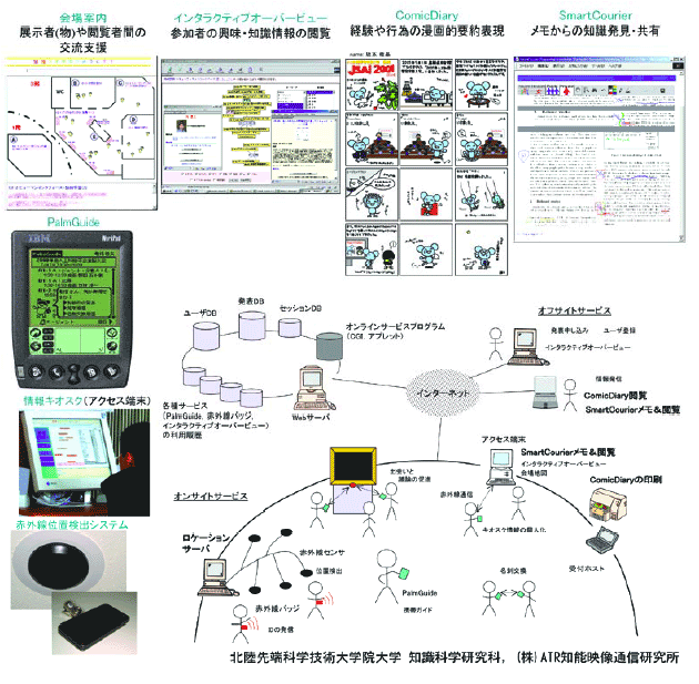 浅い感性を支援する個別アウェアネス研究の統合・集大成として、図 3.4-3に示されるデモ展示会場内のコンテクストアウェアネス環境の構築がある。デモ展示会場で赤外線バッチを着けると、特定の展示物の情報が個々人のパームガイドに表示される。その表示を読み、気になることや気づいたことをどんどんメモとして書き込んでいくと、メモ書きのアノテーションからコミュニティ内の情報交換やインフォーマルコミュニケーションの偶発的開始がおこり、これにより新しい知識が創発される。また展示物を見た感想をテキスト入力すると、その感想テキストが漫画風に要約されるというエンタテイメント性の高いツールも試作した。