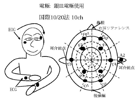 3.4-4に示すように国際10-20法に基づき脳波電極を装着し、EOG、ECGも同時に計測した。