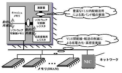 ソフトウェア制御可能なメモリ階層をハードウェア的に提供することを中心に、ハードウェアとソフトウェアの協調により、消費電力の多くを占めるVLSI間転送を減らし、高密度実装を妨げるVLSI間配線を削減しても、豊富なVLSI内バンド幅を有効に活用することで、システム全体としての高バンド幅を実現するアーキテクチャの実現を目指す研究を行う。