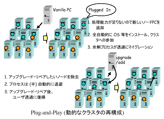 柔軟でユーザ透過、かつpartial faultに対応する高性能な耐故障性、(2) クラスタの動的な更新を可能にするplug-and-play 性、(3)