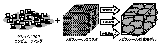 メガスケールという規模は、前述の耐故障性以外にもインターネットやグリッドコンピューティングに相通じる性質を持っている。すなわちノードの非均質性、複数クラスタの統合、大きな通信遅延など、従来のMPPやクラスタとは全く異なる性質がある。したがって、メガスケールのソフトウェア基盤やプログラミングモデルの構築の出発点として、グリッド技術の枠組を利用することが妥当かつ有望である。