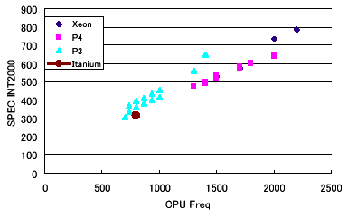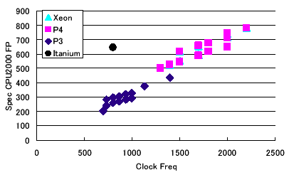 この結果から、IA32のCPUがPentium3系列からPentium4系列に移行した際の性能の伸びが素直でないことがわかる。一般に、同じアーキテクチャでクロック周波数だけを向上させる場合、性能は向上する。図1を見ると、SPECの整数系ベンチマークではPentium3系列からPentium4系列に移行した際、同一のクロック周波数(例えば1400MHz近辺)で見比べると、Pentium4の速度が10-20%遅いことがわかる。つまり、アーキテクチャを変更したことにより遅くなっている。一方、図2を見るとSPECの浮動小数系ベンチマークでは逆にPentium4の方が10-20%高速になっていることがわかる。さらに、次世代のIAプロセッサの64ビットアーキテクチャCPUであるItaniumは、図1と図2で際だった違いを見せている。整数性能では同一クロックのIA32に及ばない性能だが、逆に浮動小数性能では2倍以上高速である。図3のグラフではPentium3とPentium4の双方の系列の性能が2段に分かれて見えるが、キャッシュサイズの違いでの性能差である。