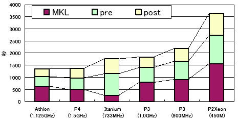 このプログラムは、大きく分けて、入力データの前処理を行なう部分(pre)と、大規模な行列演算を行なう中間部分(MKL)、演算結果をユーザに表示するため、グラフィカル処理を行なうためのデータ作成処理などの処理(post)の3つに分かれている。このグラフから、Itaniumでは中間の処理(MKL)がとても速くなっているが、全体を通しての実行時間は、同一クロックのIA32よりも実行時間が長い。実は、中間部の処理のほとんどは、インテル社が提供している行列演算ライブラリの実行時間であり、ユーザが書いたコードが実行されているわけではない。このような実行時間の分布は、ベクトル計算機でよく見られる。すなわち、専用に作られたライブラリや、特定の計算方法(規則正しい配列アクセスなど)の場合にとても高速に実行するが、そうでない場合には性能が出ていない。VLIW構造をとるItaniumのコンパイラ依存の高速化が機能していないことを示している。