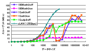 汎用のネットワークとしてEthernetが広く使われており、クラスタ内部のインタコネクトとしても100Mbps Ethernetから1Gbps Ethernetが使われている。クラスタ内の接続用の高性能ネットワークには、当初からMyrinetに代表されるproprietaryなネットワークが用いられてきた。しかしEthernetが1Gbpsの速度に達したため、Myrinetは高々2倍程度スループットが高いだけに過ぎず、ネットワークもCommodity使用に移行する傾向がある。そこで、クラスタシステムとしてSCoreを用いMPI上でPing-Pong性能を測定した結果を図4に示す。横軸は1回のPing-Pong転送のデータサイズ、縦軸はデータサイズを1往復する時間の半分で割ったもので、スループットである。Ethernetのネットワークインタフェースカード(NIC)としては、100Mbps用にRTL8139と言う廉価なカード、1Gbps用にはIntel社のEEPRO1000を用い、送受ノードの間はスイッチを経由せず直接ケーブル接続している。