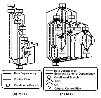 MTGにおいても、ノードはMTを、ノード内の小円は条件分岐を表す。また、実線エッジはデータ依存を表し、点線エッジは拡張された制御依存を表す。ただし、拡張された制御依存とは、通常の制御依存だけでなく、MTiのデータ依存先行MTが実行されない条件も含むものである。図1(b)中のエッジを束ねる実線アークは、アークによって束ねられたエッジがAND関係にあることを示し、点線アークはOR関係にあることを表す。MTGにおいても、エッジの矢印は省略されているが、下向きを仮定している。また、矢印のあるエッジはオリジナルの制御フローを表している。