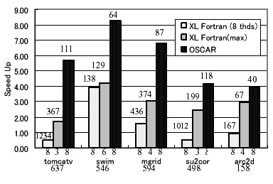 Fortranでは4スレッドで3倍の速度向上であったが、OSCARコンパイラでは8スレッド時で6.8倍の最高性能が得られた。tomcatv、swim、mgridでは、スタティックスケジューリングを用いて粗粒度並列処理を行っている。これらのアプリケーションはループ並列性が大きいため、XL