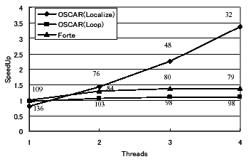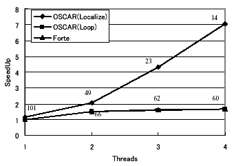 図3の1スレッド部分を見ると、OSCARコンパイラによってローカライゼーション手法を適用した結果はForteによる逐次処理の性能よりも低い性能を示しているが、スレッド数が増えるにつれて高効率を示す。この結果は、Forteではオリジナルソースプログラムに対するキャッシュタイリング技術を中心とした逐次処理最適化は非常に強力だが、ローカライゼーション手法を適用したOSCARコンパイラによる逐次処理用出力への最適化には向かないことを示している。また図3、4より、並列処理時におけるOSCARコンパイラでのループ並列性利用結果は、Forteの性能とほぼ同等かそれよりも若干低下していることが分かる。この結果は、Ultra80ではキャッシュミスヒットした際の主メモリへのアクセスが非常に高コストであるため、OSCARコンパイラによるデータローカライゼーション手法が有効であることを示している。