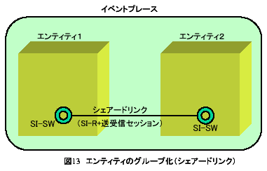 SIONetは、個々のエンティティが互いに助け合うことにより、ボランティア型のネットワークを構築する形態であり、それぞれが自律分散協調することにより、ネットワークを自己組織化する。例えば、図6は、エンティティ1がイベントプレースを生成している状況を表している。このとき、エンティティ2がエンティティ1に対して、イベントプレースへのJoin要求を行うと、図13に示すように、エンティティ2にSI-SWが生成され、さらに、SI-SW間にシェアードリンクが確立され、エンティティグループが形成される。このとき、イベントプレースの生成者であるエンティティ1がイベントプレースから退去すると、SI-SW間のシェアードリンクが解除され、以降は、エンティティ2のみでイベントプレースの構築・運営が継続される。ここで、シェアードリンクは、エンティティグループを形成するための仕組みであり、マルチホップの経路でもある。
