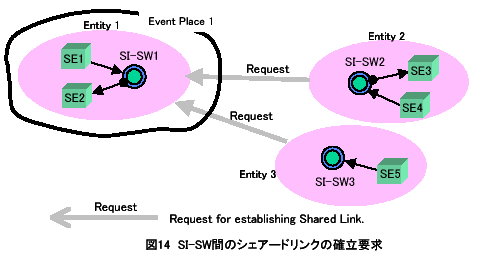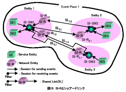 | A | このとき、図15に示すように、エンティティ1は、SL1,2を確立するために、SI-R1,2を動的に生成するとともに、エンティティ2をシェアードリンクの確立要求元であることを記憶する。厳密には、エンティティ2のエントリポイントとグローバルエンティティ名(SI-SW2)を記憶する。ここで、SI-Rは、意味情報に基づいて、SI-SW間のイベントルーティング(イベント転送)を行う「意味情報ルータ」である。 | ||||
