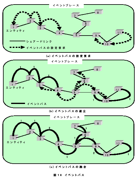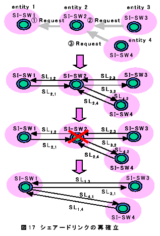 図17において、シェアードリンク確立要求の先頭数字は、それらの要求順序を示している。つまり、エンティティ2からエンティティ1へシェアードリンクの確立要求を行う。次にエンティティ3からエンティティ2へシェアードリンクの確立要求を行う。最後に、エンティティ4からエンティティ2へシェアードリンクの確立要求を行う。なお、ここで、「各エンティティは、同一イベントプレース内においてシェアードリンクの確立要求を高々1回しかできないが、無制限に確立要求を受け付けることが可能なリンクトポロジーに基づいて、シェアードリンクの確立を行う」リンク確立手法を提案する。これにより、シェアードリンクで結合されたエンティティ間に、ループが発生しないことが保証される。すなわち、この手法を用いることにより、隣接エンティティ間のリンク再確立のみで開リンクトポロジーを簡単に実現できる。