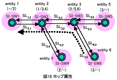 例えば、@のホップ属性を指定した場合の、イベントの流れを図18の破線で示している。図18において、( i /j )は各エンティティにおいて記憶している、シェアードリンクの確立情報である。 iはエンティティがシェアードリンクの確立要求を行った先のエンティティを示しており、一方、jはエンティティがシェアードリンクの確立要求を受け付けたエンティティを示している。例えば、エンティティ3の( 2/5,6 )は、エンティティ3がエンティティ2に対して確立要求を行い、エンティティ5およびエンティティ6から確立要求を受け付けていることを表している。各エンティティがシェアードリンクの確立情報を保持することにより、例えば、エンティティ3が他のエンティティに対して、更なるシェアードリンクの確立要求を行った場合、その要求をエラーとしてリジェクトすることができる。これにより、前述した開リンクトポロジーの一貫性を保証している。この状況において、エンティティ6が3ホップで@のホップ属性を持つイベントを送出することにより、エンティティ1とエンティティ2の存在を知ることが可能になり、これらがエンティティ3障害時の代替エンティティとなる。