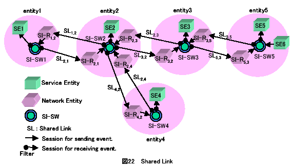 | B | SI-R1,2は、エンティティ2に対してイベント受信セッションの確立要求を行うことにより、SI-SW2に対してイベント受信セッションを確立する。さらに、自身が属するSI-SW1に対して、イベント送信のためのセッションを確立する。このようにSI-Rが確立する送受信セッションの組み合せをシェアードリンクと呼ぶ。 | ||||