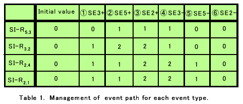 表1において、SE i+は、サービスエンティティiが、フィルタ登録したことを意味している。一方、SE i-は、サービスエンティティが当該フィルタを解除したことを意味している。また、表中の数字は、SI-Rが保持しているイベントパス管理のためのカウンタ値であり、SI-RがSI-SWに対して、イベントパス設定のためのフィルタ登録を行っている回数を示している。このような管理は、イベントタイプ毎に行われる。但し、SI-RからSI-SWに対する実際のフィルタ登録は、カウンタ値が0から1へインクリメントされたときに行われるだけであり、たとえば、1から2へ遷移する場合には、フィルタ登録は行わずに、フィルタ登録が要求された旨のみをカウンタで記憶している。同様に、サービスエンティティがフィルタ解除を行った場合には、イベントパスの更新のために、カウンタをデクリメントするが、SI-RからSI-SWに対する実際のフィルタ解除は、カウンタ値が0になったときに始めて行われる。これにより、イベントパスの設定要求や解除要求が、順次、自律的に波及(伝播)していく回数を必要最低限に抑止したキャッシングが可能になり、イベントパス制御のオーバヘッドを低減することができる。