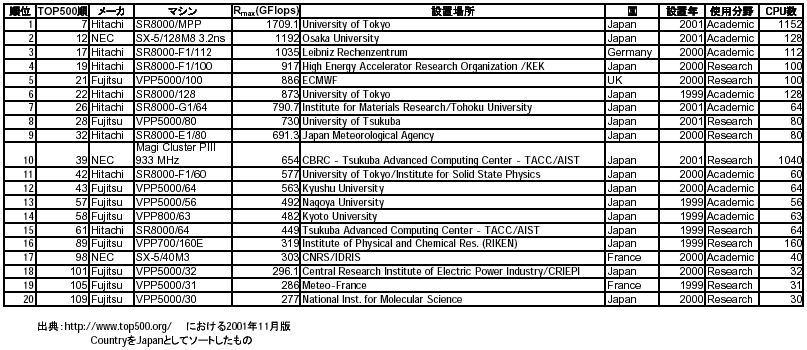 付表3 日本製ハイパフォーマンスコンピュータ Top20