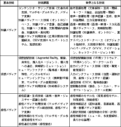 ヒューマンメディア技術は、人間主導という立場・方向性をもつマルチメディア技術の体系の総称であるが、現時点での主な要素技術としては、知識メディア技術、仮想メディア技術、感性メディア技術、およびそれらを融合・統合化したメディア技術から成る。