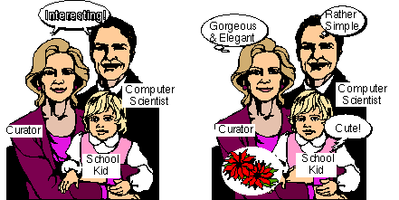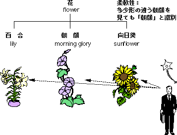 例えば図3.8-1の例を考えよう。人間は花を見て「これは、少ししおれかかった向日葵だ。」と知覚する。この過程では、「向日葵」は「花」で総称されるオブジェクトクラスの中の一つのサブクラスであり、今、目の前にあるこの「しおれかけた向日葵」はその中の一つのインスタンスである、ということを、知識とパターンとを組合わせて理解していると考えられる。従来のマルチメディア技術は、そのようなメカニズムを計算機の上でシミュレーションするためには、どう実現するか?といういうのが、主要な目的であった。しかし、これは「火星に無人探査ロボットを飛ばして、人間に代わって、人間の居ないところで、ロボット自身に自律的に環境を判断させながら、あちこちを歩きまわらせて、探査させる類の技術」と言える。つまり、人間との関わりや、人間がその環境をどう認識するか(さらには主観的にどう解釈するか)、等とは直接、関係のない技術といえるのである。