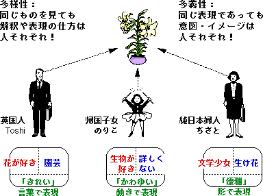 例えば図3.8-2の例を考えよう。「百合の花」を見た時に、それぞれの人はどう思うだろうか? それぞれの人は、思った事をどのように人に伝えるだろうか?英国文化に憧れを持つ中年紳士、純日本的な感性を持った婦人、小学生の少女、それぞれに、知識のバックグラウンドも違う、どのように主観的に感じるかの知覚過程も異なる、さらに、それを誰かに向かってどう表現するかの表出過程にも、結構な違いが観察されるのが普通である。