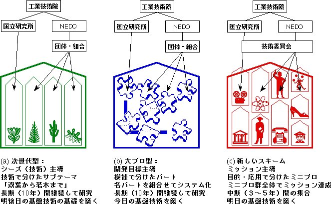 シーズ主導・技術主導で、ある特定の技術を「双葉から若木まで」育てるもの、遠い将来を目標に置いた基礎寄りの研究開発は、技術で分けたサブテーマ(それぞれの双葉)をじっくりと育てるのには良い制度であるが、明日の基盤技術からは遠い、各双葉間の関係が希薄であるなどの問題点もある。一方、開発目標主導で、ある特定の大艦巨砲的システムを開発するもの、どちらかと言えば、ソフト開発よりもハード開発に適した制度で、開発目標を機能で分割して、各パートを研究開発し、「ジグソーパズル」のように各パートを組合せて一つのシステムを作る制度がある。これは、今日必要な基盤技術を築くための制度である一方で、先行的な研究が位置付けにくく、システム開発に勢力を注ぐが、システムや基盤技術を社会に定着させる努力が二次的になりがちである。