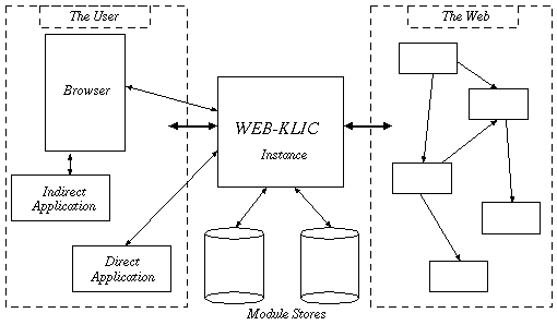 In the last two months we have performed a preliminary exploration of this issue. The result of this study is a simple plug-in for the Netscape browser. The plug-in recognizes a novel MIME type (application/x-klic) which indicates the presence of a WEB-KLIC module in a document accessed by the browser. We propose to use this preliminary interface as the key component for client-side WEB-KLIC computations. Figure 1 illustrates the structure of this new component of WEB-KLIC. A thin layer, activated by the Netscape plug-in component, will filter the incoming documents and perform the desired operations on the embedded WEB-KLIC modules -- e.g., combination with other modules, execution of goals against them.
