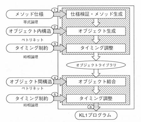 図にMENDELS ZONE におけるソフトウェア開発の流れを示す。(1) では等式論理による 機能(メソッド)仕様が入力され、その正しさが並列に自動検証される。(2) で はそれらの構造がペトリネット表示される。(3) では時相論理による機能間の タイミング仕様が入力され、その仕様を満足するように(2) のペトリネットが 並列に自動調整される。(4) では複数のオブジェクトがペトリネットエディタ を用いて結合され、(5) ではオブジェクト間のタイミング仕様が入力され、 (4) のペトリネットが自動調整される。最後に(6) でこれらの仕様がKL1プロ グラムへ変換される。