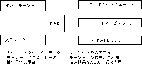 従来のフルテキストサーチのように単なる表層の文字列だけでなく、例えば、 『(人間)ガ(場所)デ〜スル』のような文法情報も含んだ複雑なキーワード(構 造化キーワード)を指定できるため、種々の言語現象を抽出でき、日本語処理 を行うために必要な辞書や文法などの収集、構築に有効である。