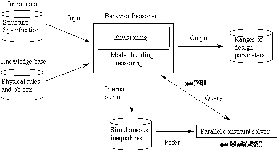 Desqは、設計パラメータの値を未定にした電子回路の構成とその回路が振る舞 うべき仕様が与えられると、トランジスタやキルヒホッフの法則などの深い知 識を使って、未定で与えられた設計パラメータの範囲を求める。具体的には、 並列制約ソルバー(Consort) を使いながら回路全体のモデル (連立不等式とし て表現される) を構築する。モデル構築に際して、評価できない変数があった 場合は、その変数の範囲を仮定しながら推論を続ける。さらに、回路の時間的 変化を推論し、仕様を満足する挙動を求める。この推論の副作用として、未定 で与えられた設計パラメータの範囲を求めることができる。