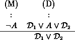 CMGTP はこのような欠点を補うため、MGTP に負アトムを導入し、また、以下 に示すような unit refutation、unit simplificationのメカニズムを導入す ることによって、負の情報による制約伝搬を可能にした。ここで、$M, D$ は それぞれモデル候補集合、モデル拡張候補集合を表す。