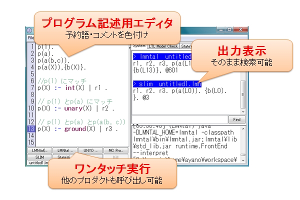 ボタンを押すとすぐにLMNtal 処理系で実行され、出力は機能部に表示されます。