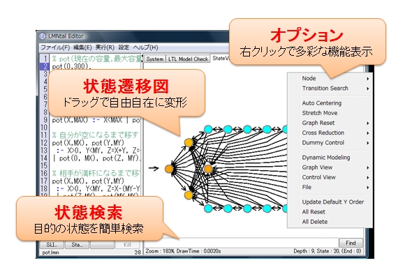 State ViewerはLMNtalプログラムの実行経路を網羅的に探索した結果を解析し可視化を行います。