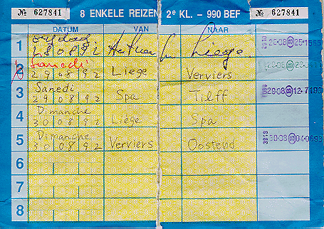 「でもな、これよりこのGO PASSっていうのの方が安いぞ。」GO PASSというのは、6ヵ月間有効でその間に8回使える。990BF(ベルギーフラ ン)だから、4500円ぐらい。乗り換えもOKなので、行かないところでも、取り 敢えずできるだけ遠めに書いておくとgoodだ。窓口の人が親切に教えてくれた のでGO PASSを買った。