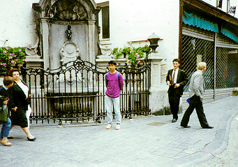グランドプラスに戻る直前。地図にバツ印が付いている。 でも、そこに向かって歩いていっても、なにもなさそうだ。 おみやげ屋が一軒あって、人がウロウロしてるなぁ…と思ったら、 ありました。小便小僧。これが元祖小便小僧ですね。 広場真ん中にあるような感じがするが、本当に路地の角っこに 突然あるという感じ。小便小僧をしみじみと1時間ぐらい見てた(嘘)。 30秒ぐらいかぁ…(笑)。