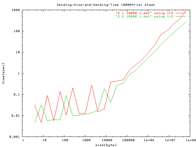試行回数を最大10000にしたときの転送サイズと転送時間