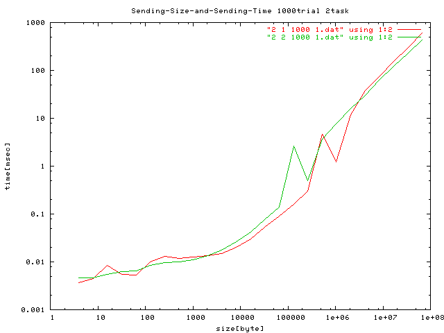 試行回数を最大1000にしたときの転送サイズと転送時間