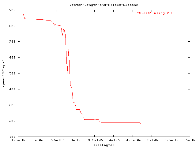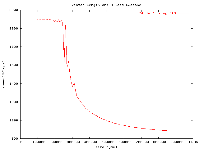 2次キャッシュ容量付近にある、ベクトルの長さと性能