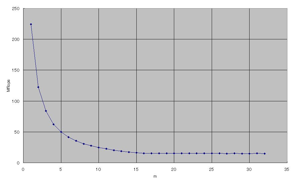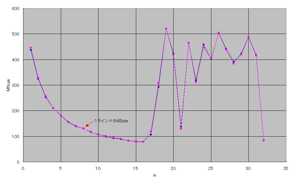 図1では、m=16までは次第に遅くなっていき、その後はグラフが激しく変化しました。何度実行しても同じようなグラフが出てきました。1次キャッシュのラインサイズは64Byteなので、理論上はm=8でグラフは一定になるはずです。このような結果になった原因はよく分かりませんでした。