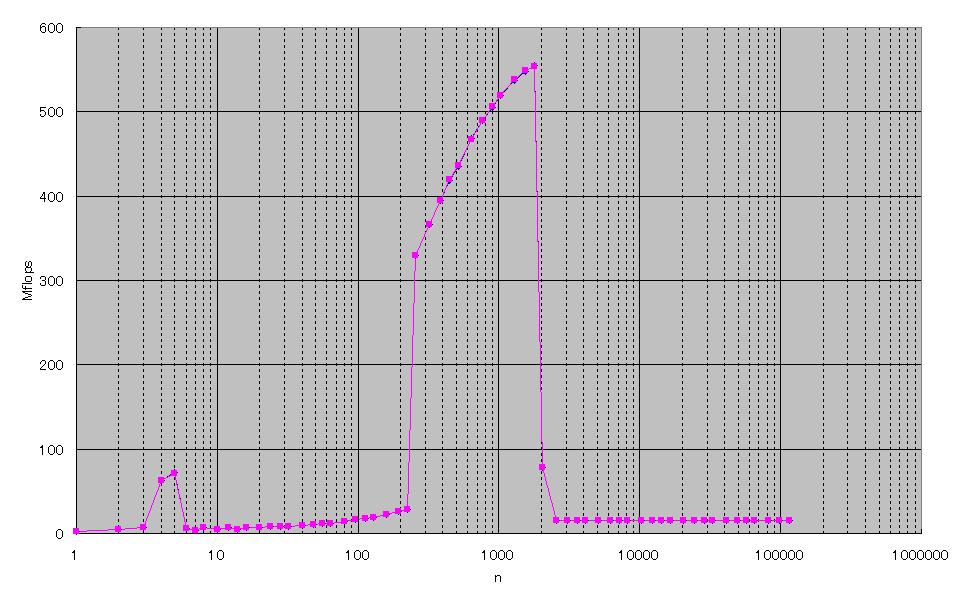 ストライドアクセスにしたことで全体的に速度が著しく低下していることが分かります。しかし、1次キャッシュあふれの影響を確認する事はできませんでした。なお、n=2Kにおける速度低下は2次キャッシュあふれによるものです。