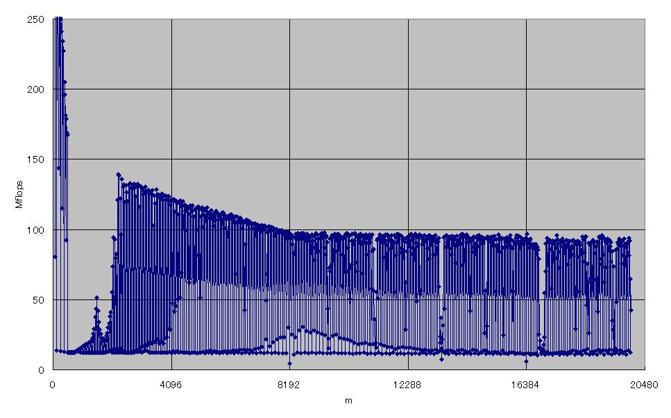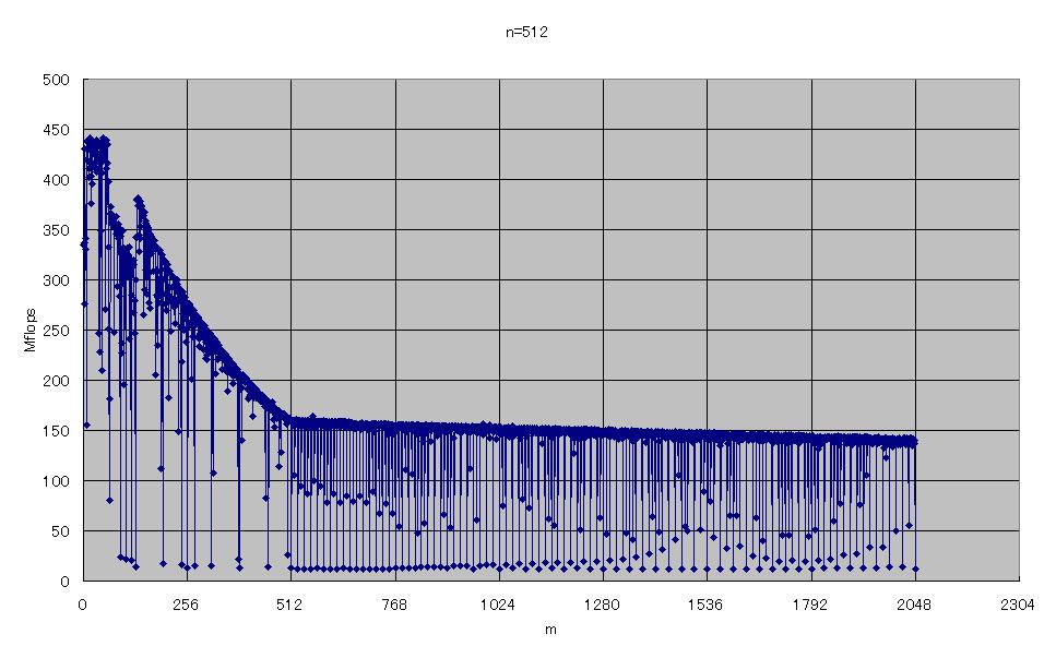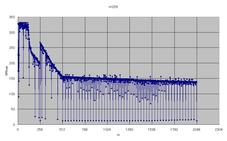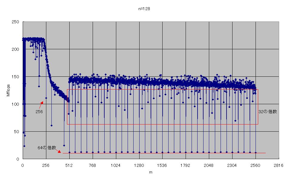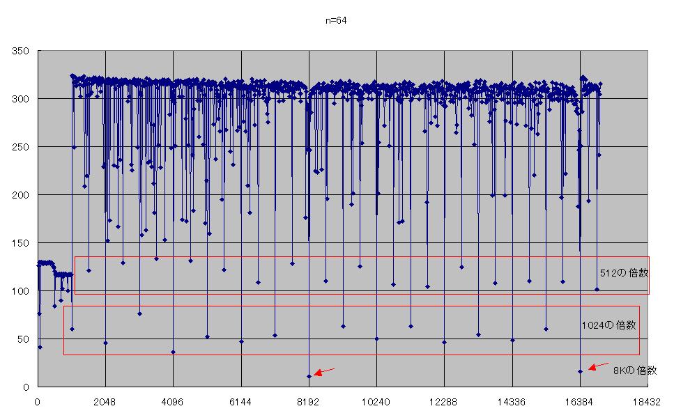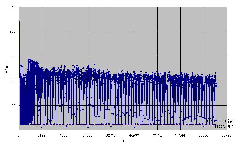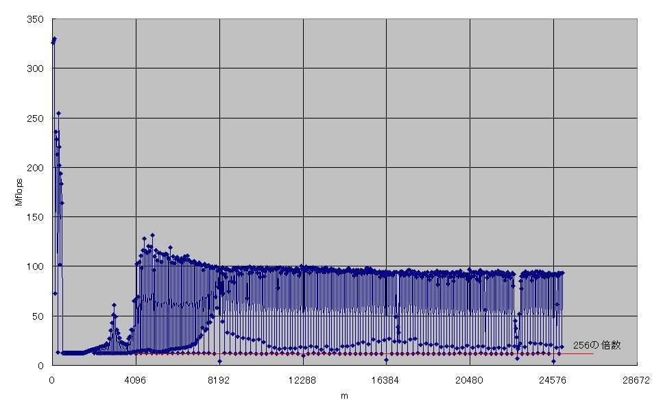 右から二列目の性能低下は、m×nが64Kの倍数、すなわち配列のサイズが512KBの倍数のときです。これは2次キャッシュの容量の2倍なので、2次キャッシュのライン衝突によるものと考えられます。それ以外にも、m×nが一定の値で遅くなっていますが、原因はよくわかりません。これらの中には、あまり大きな変化ではないものもありますが、はっきりとその部分だけ遅くなっているものもあります。