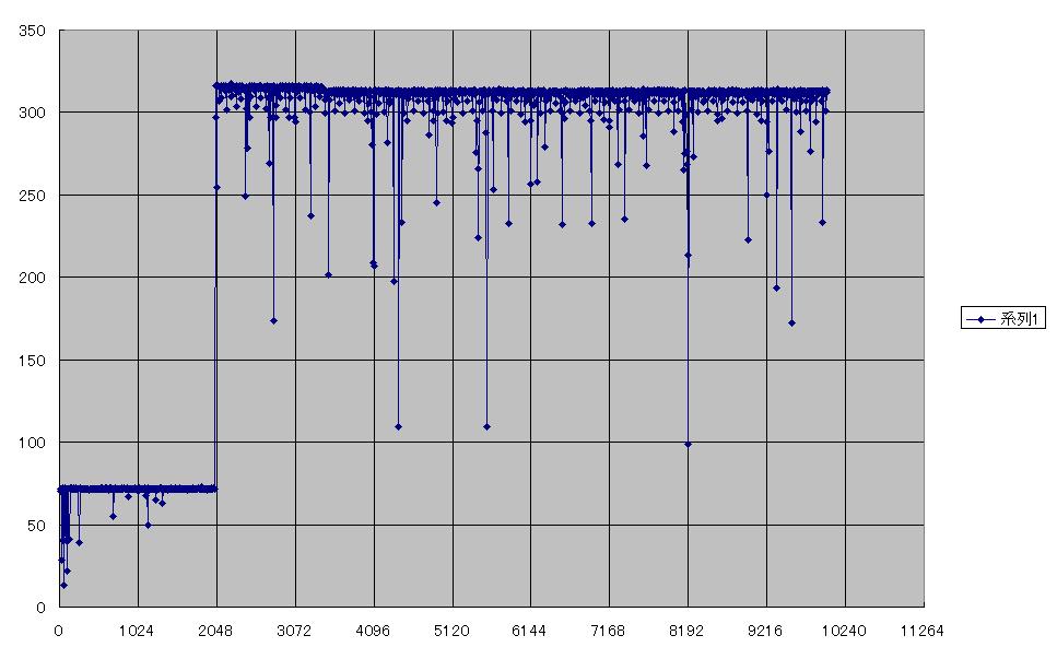 また、配列TLBのサイズを超えると、TLBあふれによる大幅な性能低下が起こります。この時、ストライドの間隔mがページサイズ以下の場合は、mを増やすとページ更新の頻度が上がる為に性能が次第に低下していきますが、ページサイズ以上になった時点で毎回新しいページが必要になり、上記のライン衝突部分以外では性能はほぼ一定になります。