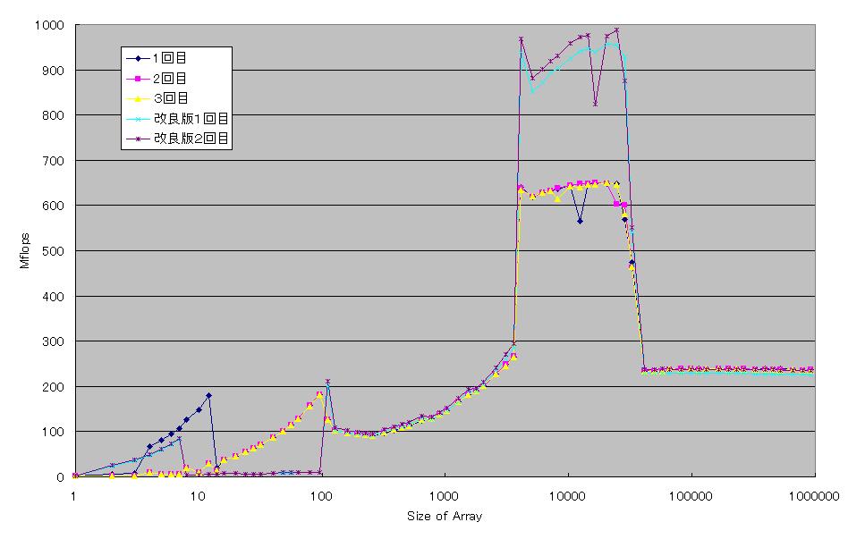 なお、Microsoftのコンパイラを使った場合、gccと比べてループアンローリングの効果は出にくいようです。gccで試してみたところ、研究室のPentiumIVマシンmahonではアンローリングによって7.4倍になりました。一方、Pentium IIIマシンのbrieでは2.6倍でした。