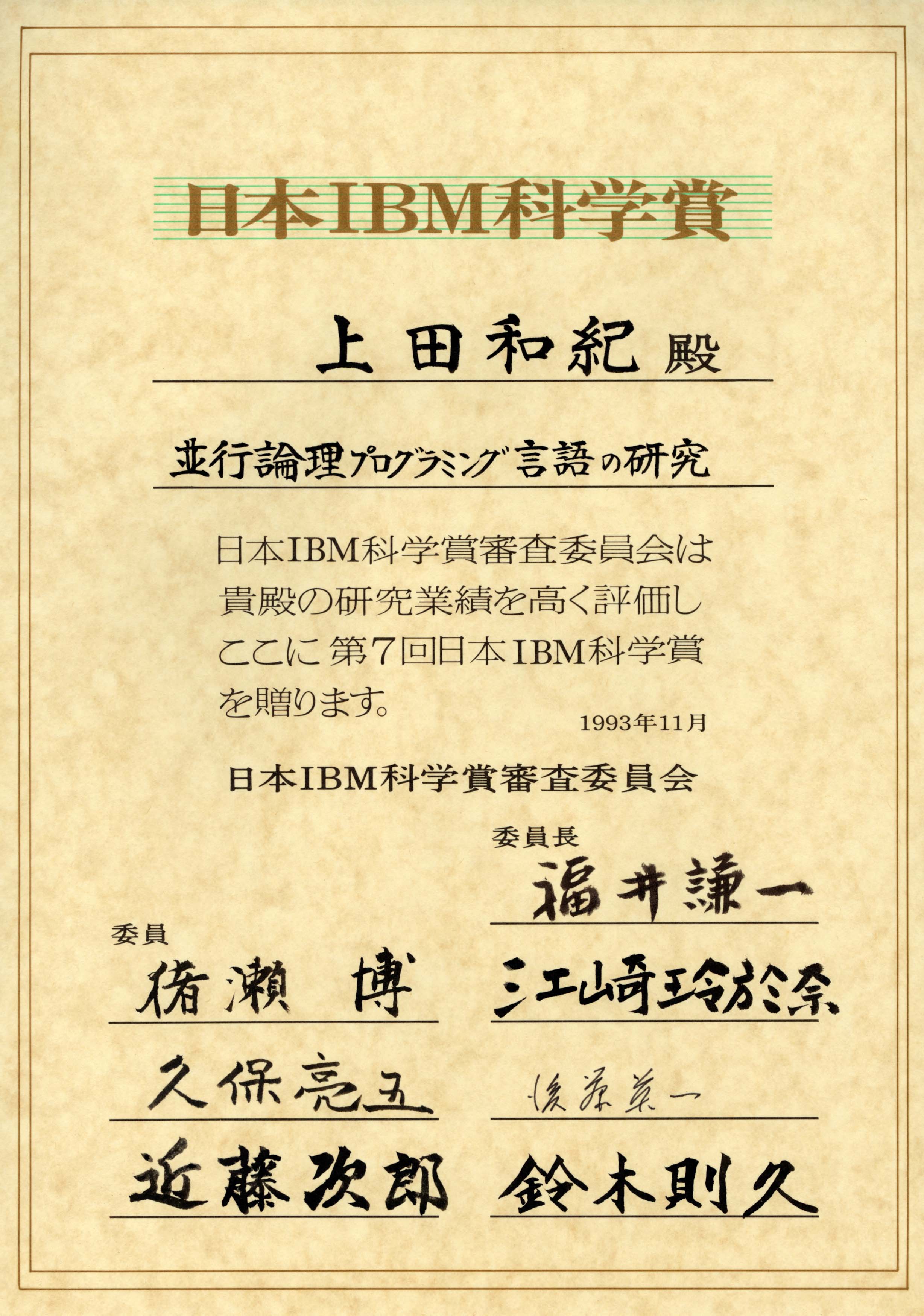 | 1993年 | 第7回日本IBM科学賞(コンピュータサイエンス分野) 「並行論理プログラミング言語に関する研究」(贈賞の理由, cached by web.archive.org) |